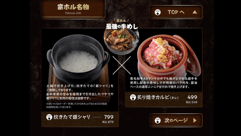 「1つ目はお客様をお席に案内する際におすすめ商品のPRを行うことです。テーブルオーダーの使い方や各種タレの説明と合わせてメニューを紹介します。特に6大名物の銀シャリご飯は提供まで時間がかかるので、最初にオーダーしていただきやすいようにご案内しています。初回の注文だけはハンディ端末で受け、お客様との接点を大切にしています。」