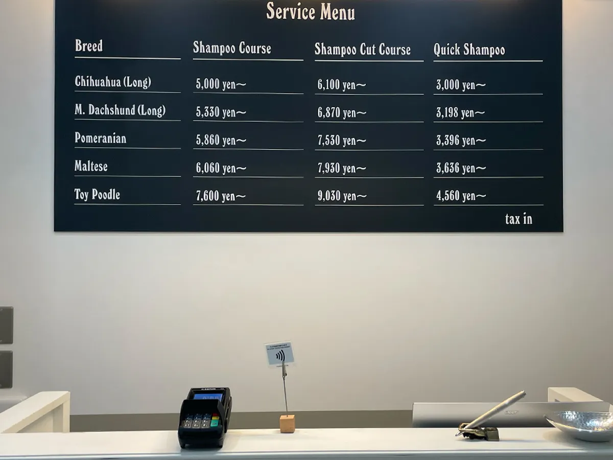 今回POSレジをご導入いただいたのは、相模原にありますドッグサロン、DogSalon Tailor様。ワンちゃんの気持ちに寄り添ったお手入れのできるサロンを目指しており、予約は60日先まで埋まっており、LINEでのご予約や次回予約が多い店舗様とのこと。こちらの店舗オープンのタイミングに合わせてPOSレジをご導入いただきました。