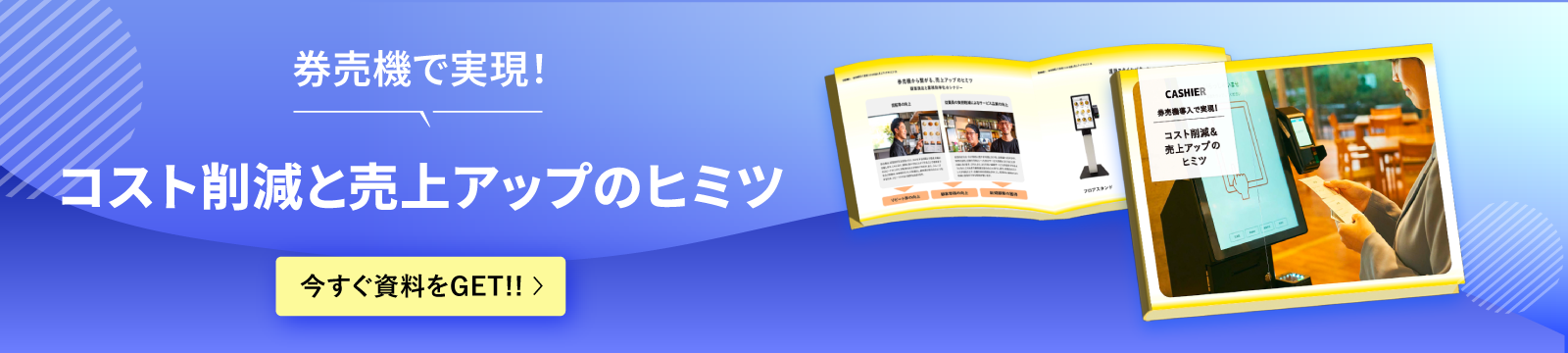 この記事では、券売機の費用相場をまとめて紹介しました。 基本的に高性能になるほど高価になります。ただし、自社に必要な機能が搭載していない場合には、思ったような効果が得られないこともあるでしょう。そのため、まずは自社に必要な機能を確認することがおすすめです。 これまで多くの飲食店や小売店に券売機を提供しているCASHIERでは、タッチパネル券売機を提供しています。はじめて利用する方も操作しやすい21インチタッチパネルを採用。主要50ブランドのクレジットカードや電子マネー・QRコード決済に対応しており、販売機会を見逃しにくいのも魅力です。タッチパネル券売機を検討されている企業の方は、ホームページをご覧ください。 関連記事:CASHIER「タッチパネル券売機」 【以下のフォームを入力して資料を無料でダウンロード】↓ 「注文から決済までをセルフ化する」タッチパネル型券売機”