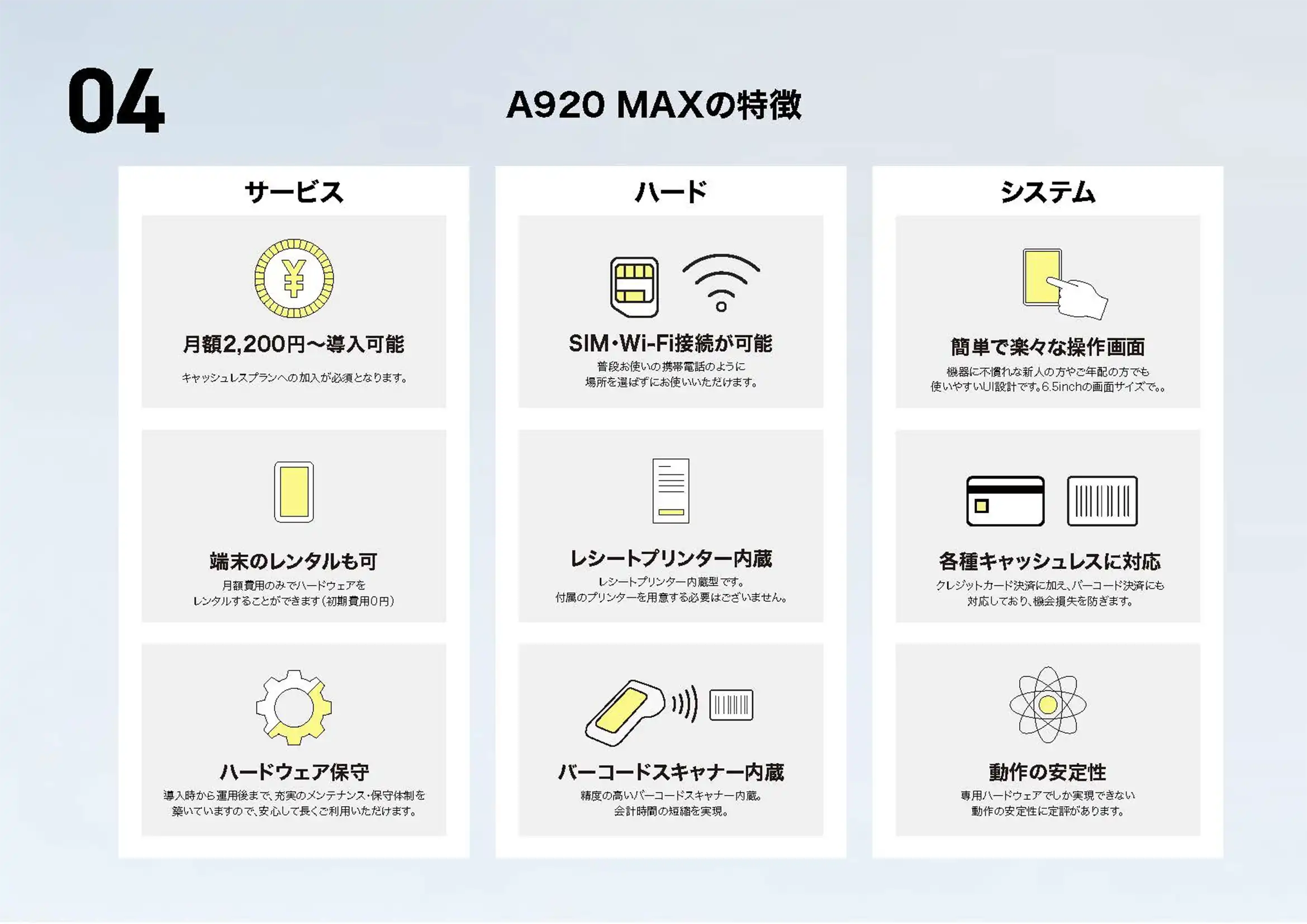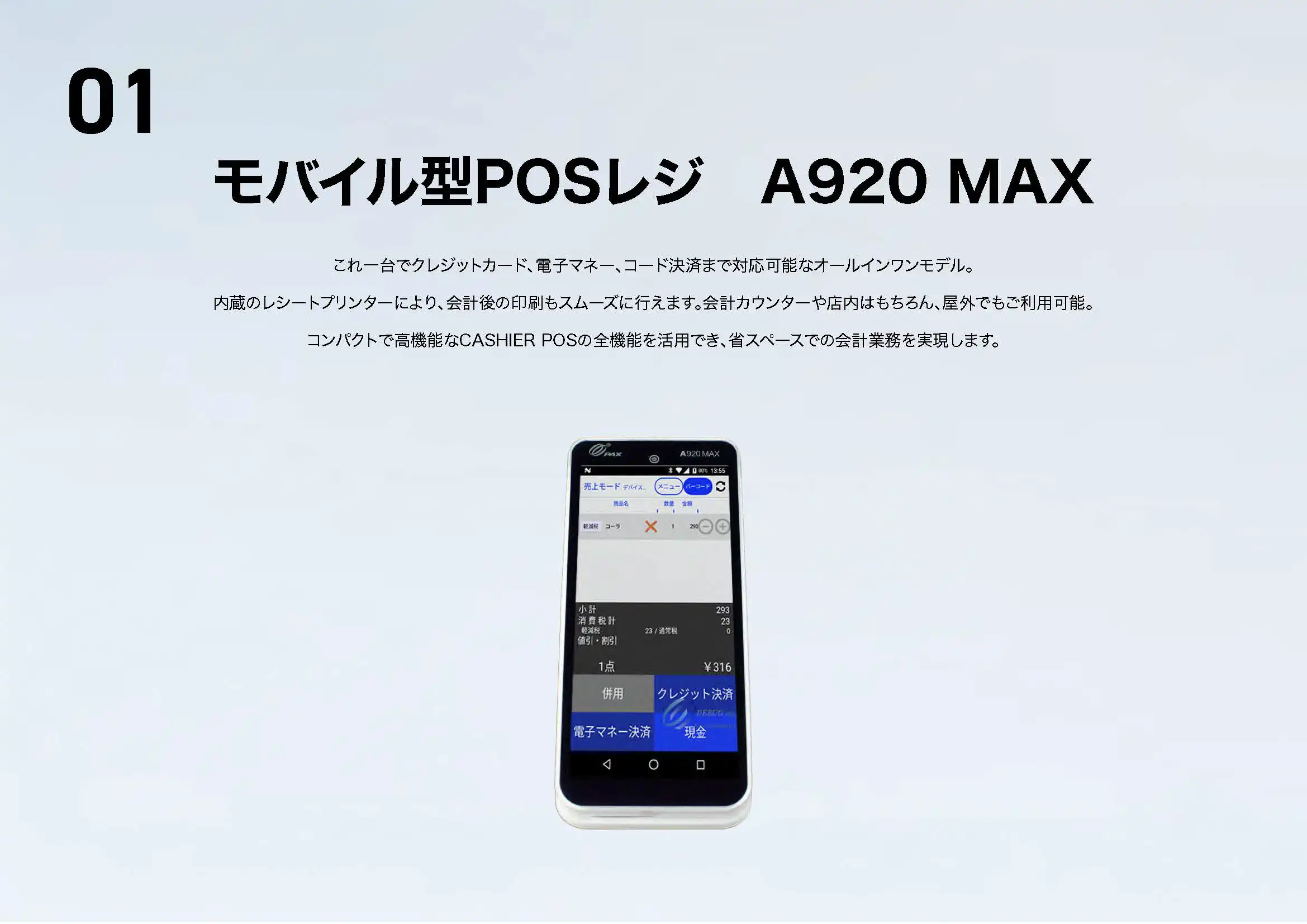 レジ周りの省スペース化や、多様化するキャッシュレス決済対応にお悩みの店舗オーナー様必見!最小サイズのオールインワン端末A920 MAXが登場しました。クレジットカード、電子マネー、QRコード決済にこれ一台で対応し、レシートプリンターも内蔵。キッチンカーやライブ会場など、場所を選ばない柔軟な運用を実現します。直感的でシンプルなUI設計により、新人スタッフでも迷わず操作でき、教育時間を大幅に短縮。操作ミスを防ぎ、人件費の最適化をサポートします。導入前から運用後まで、お客様に寄り添い続けるサポート体制のCASHIERで、安心の店舗運営を始めませんか。