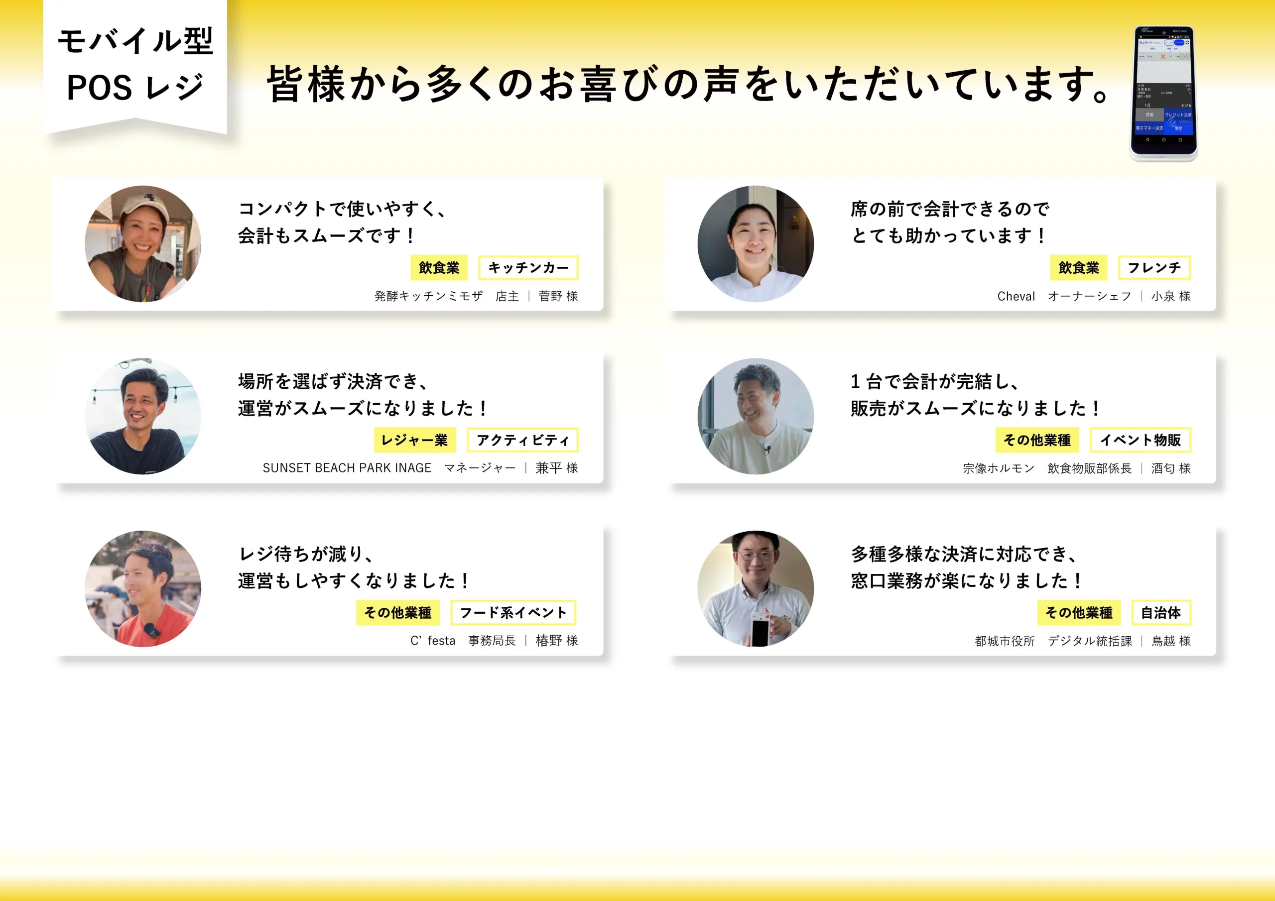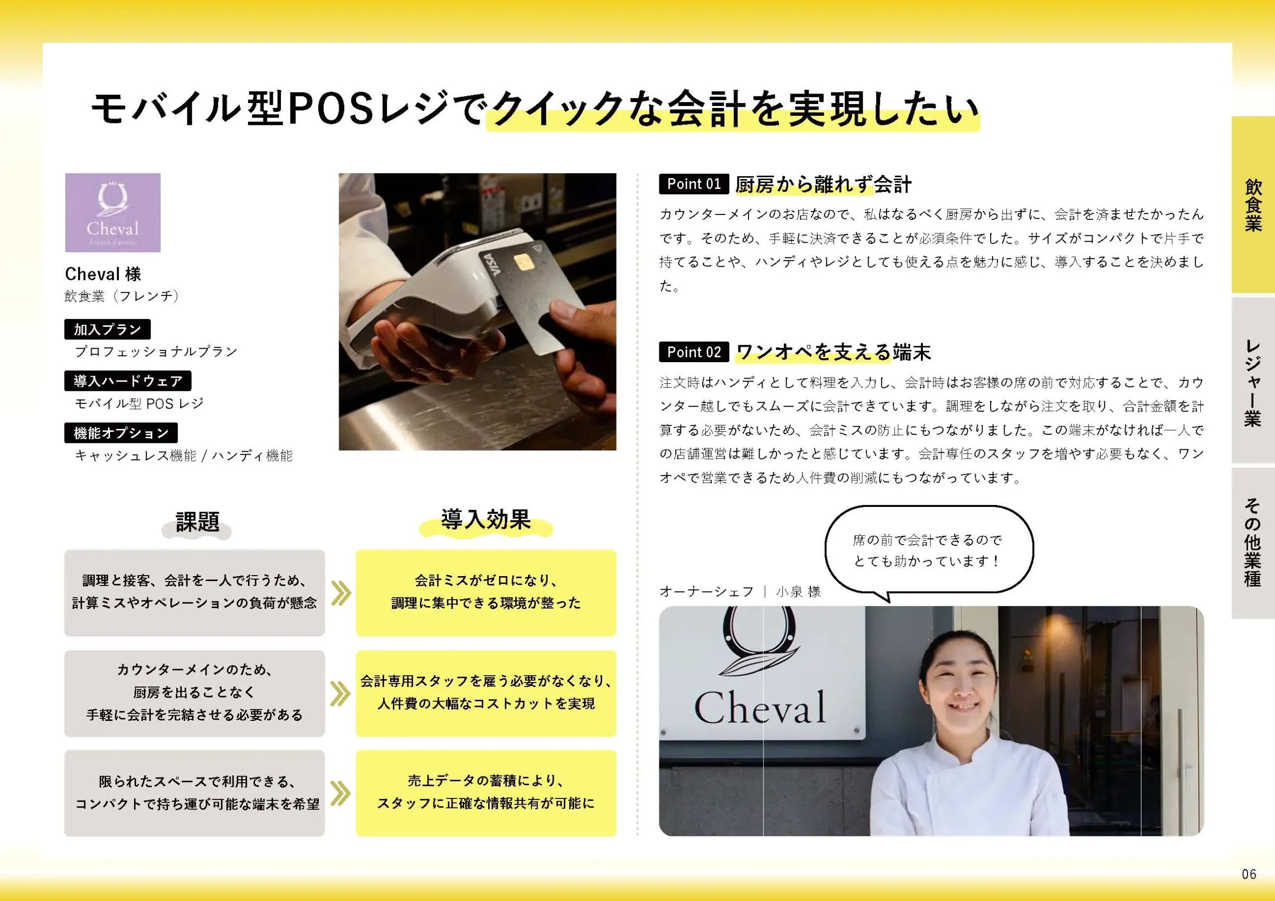 本資料では、これ1台で各種キャッシュレス決済からレシート発行、売上データ管理までが完結するモバイル型POSレジの「導入事例」を多数ご紹介しています。 キッチンカーやフレンチレストラン、イベント物販、さらには自治体の窓口まで、多様な業種での人件費削減や回転率向上のリアルな成功のヒントが満載です。場所やスペースの制約から解放される新しい店舗運営に、ぜひお役立てください!
