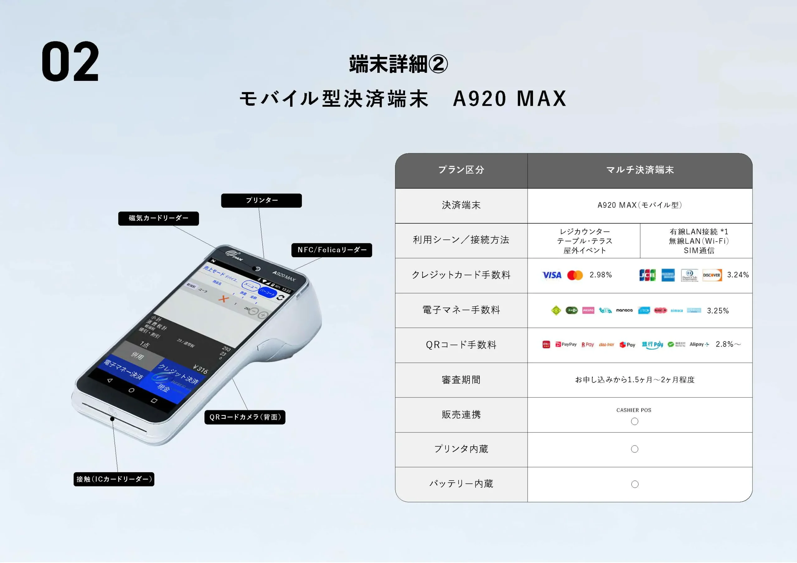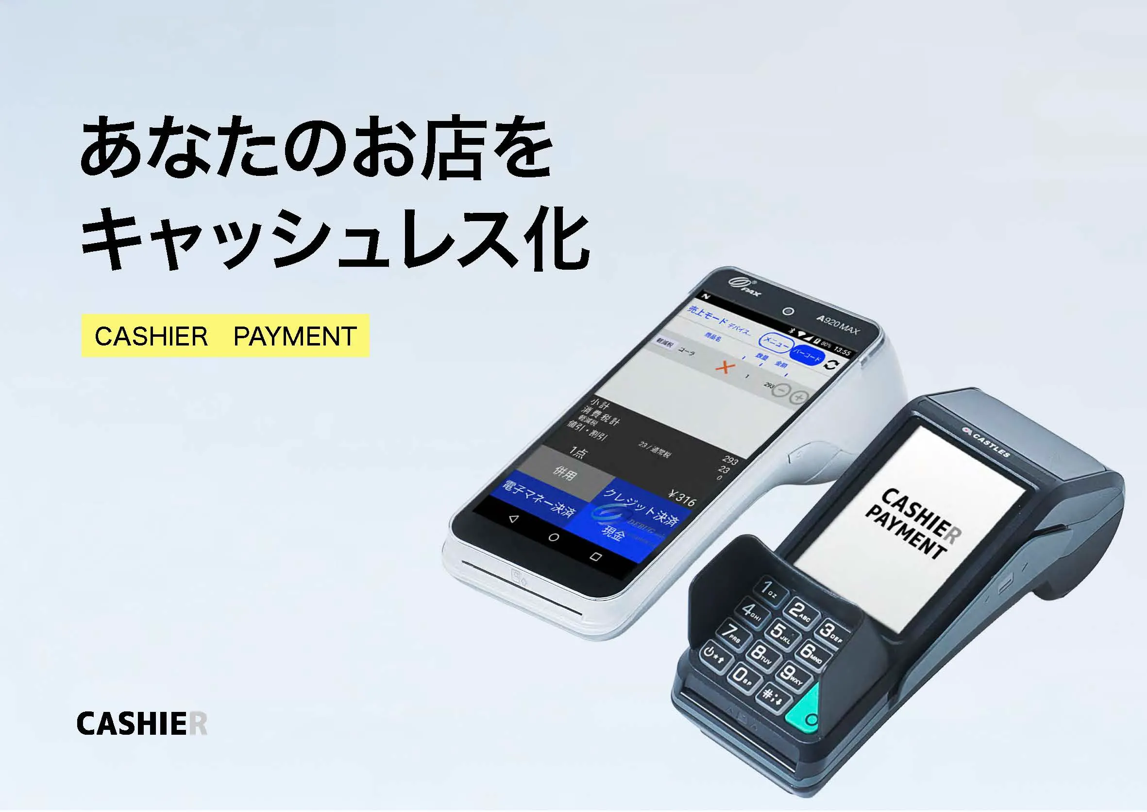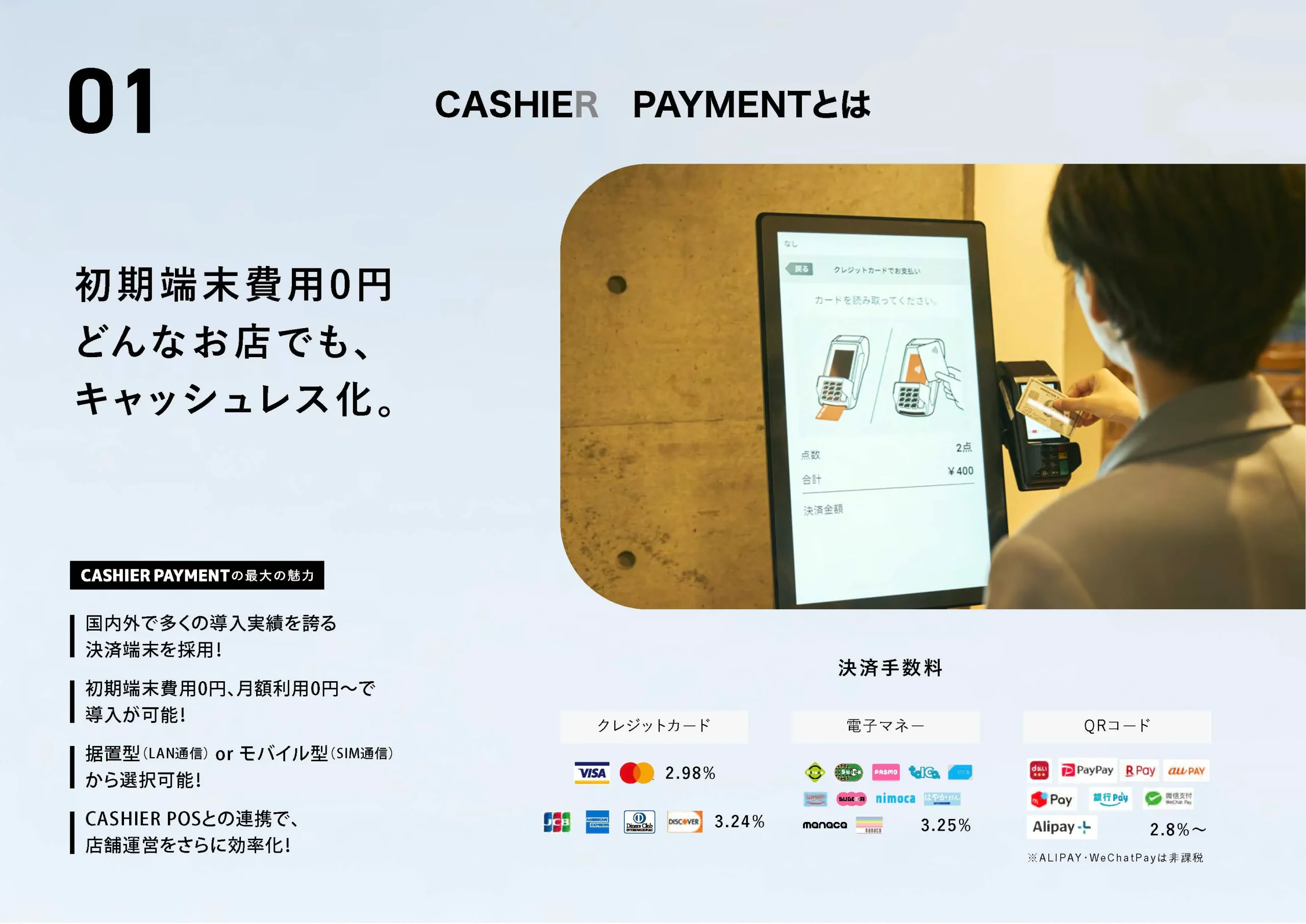 CASHIER PAYMENTは、初期端末費用0円、月額利用料0円〜で導入可能なマルチ決済サービスです。国内外で実績豊富な決済端末を採用し、クレジットカード、電子マネー、QRコードに対応しています。