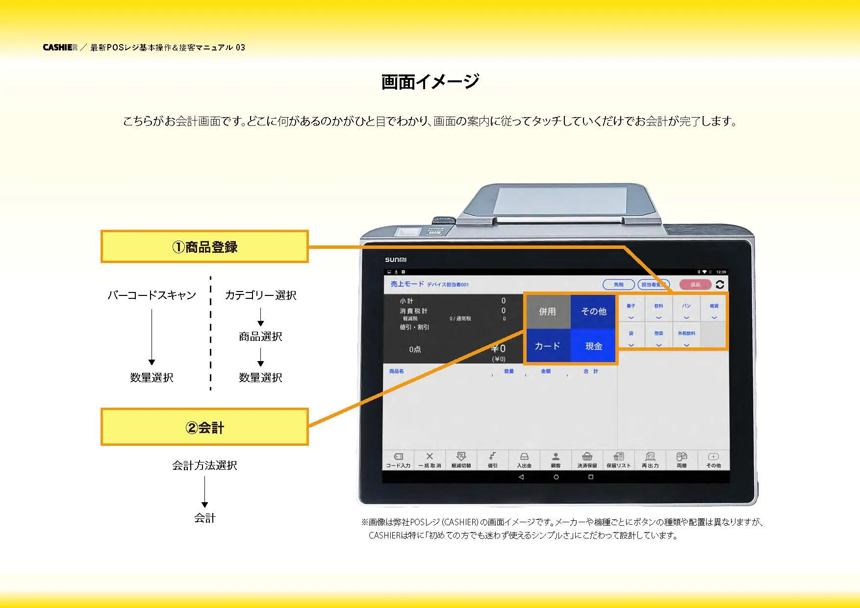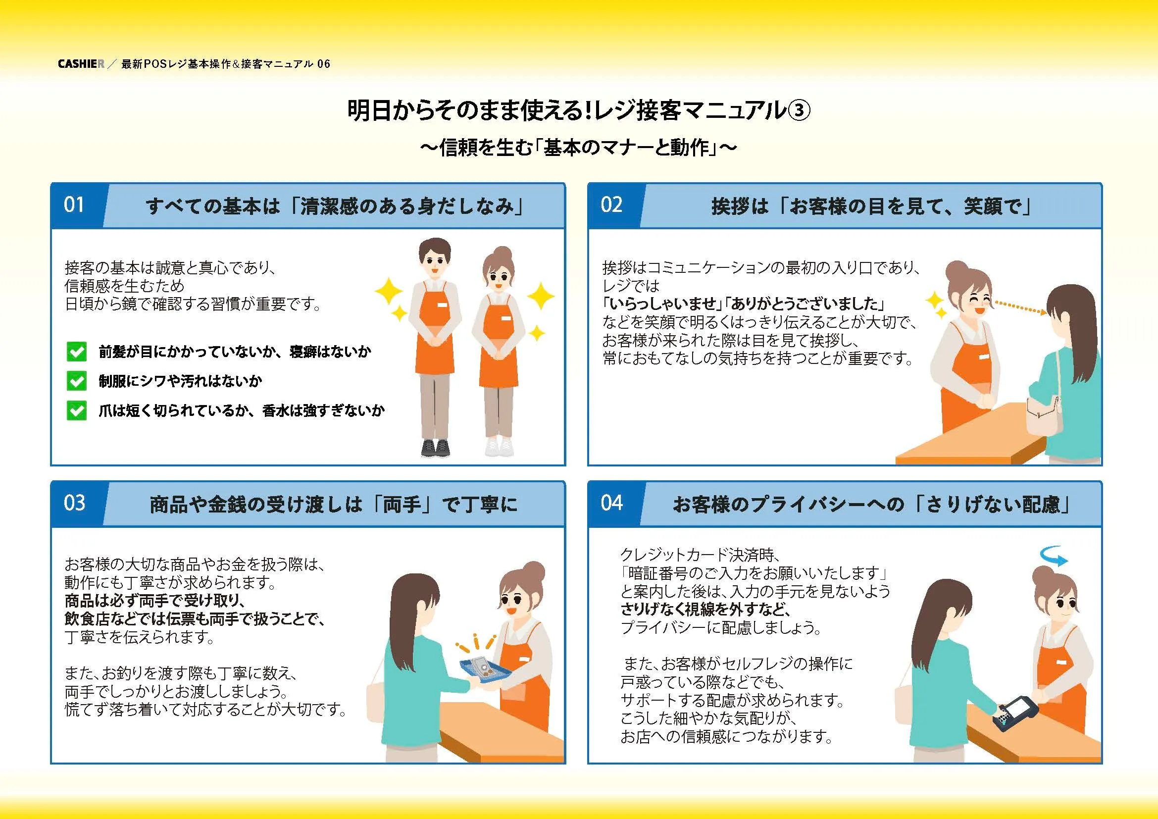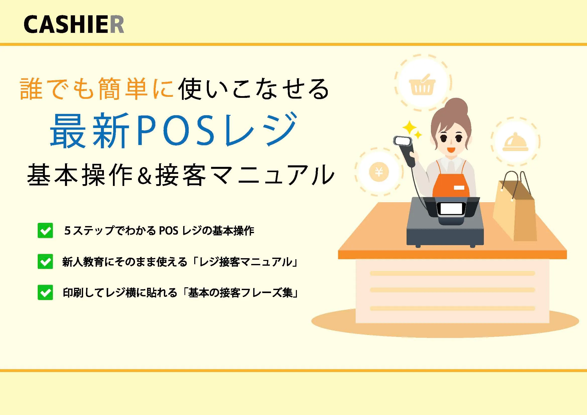 本資料では、5ステップの基本操作から、明日から使える「レジ接客マニュアル(NGワードや基本マナー等)」までを網羅。誰でもその日から”プロのレジ対応”が可能になるノウハウが満載です!