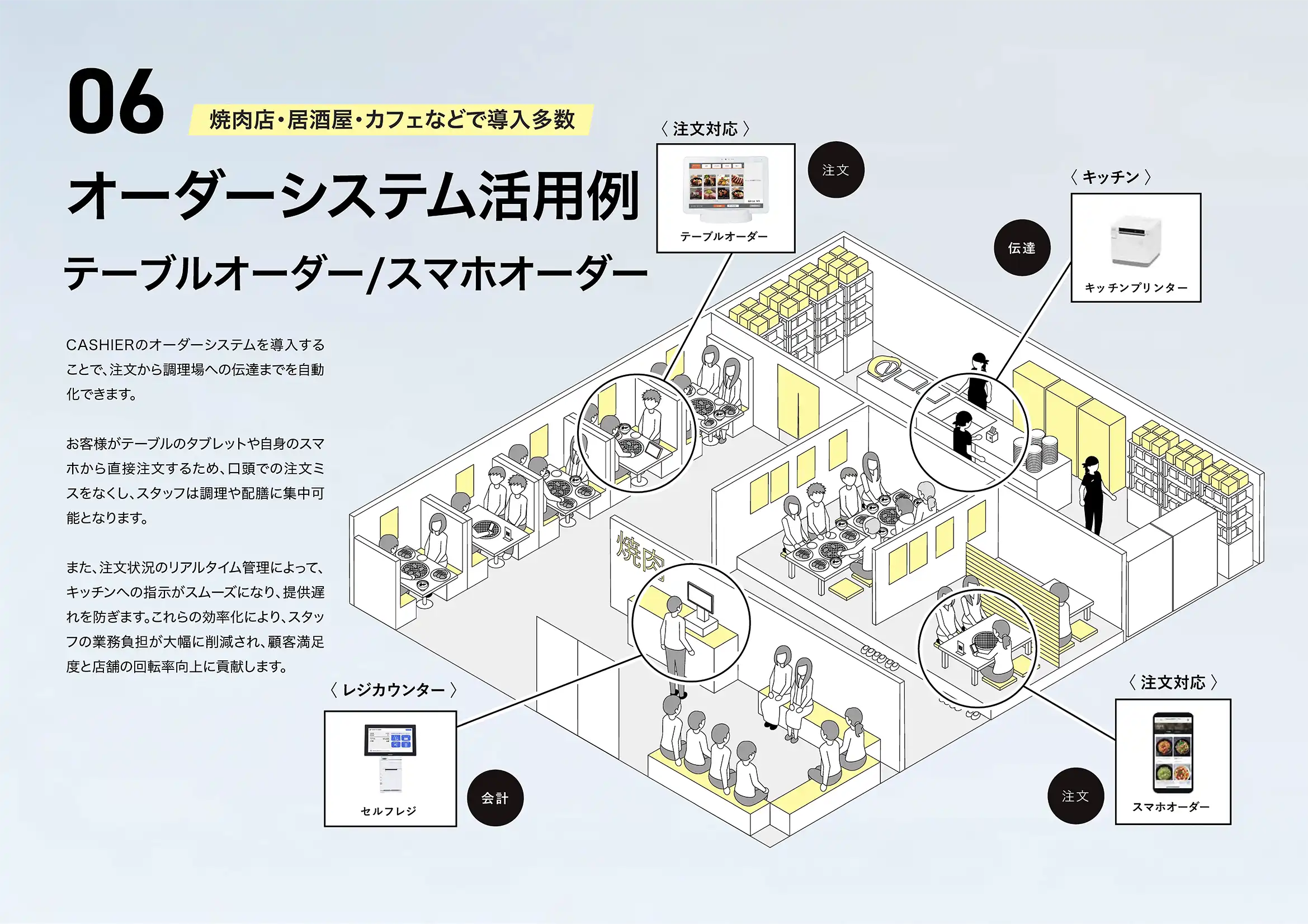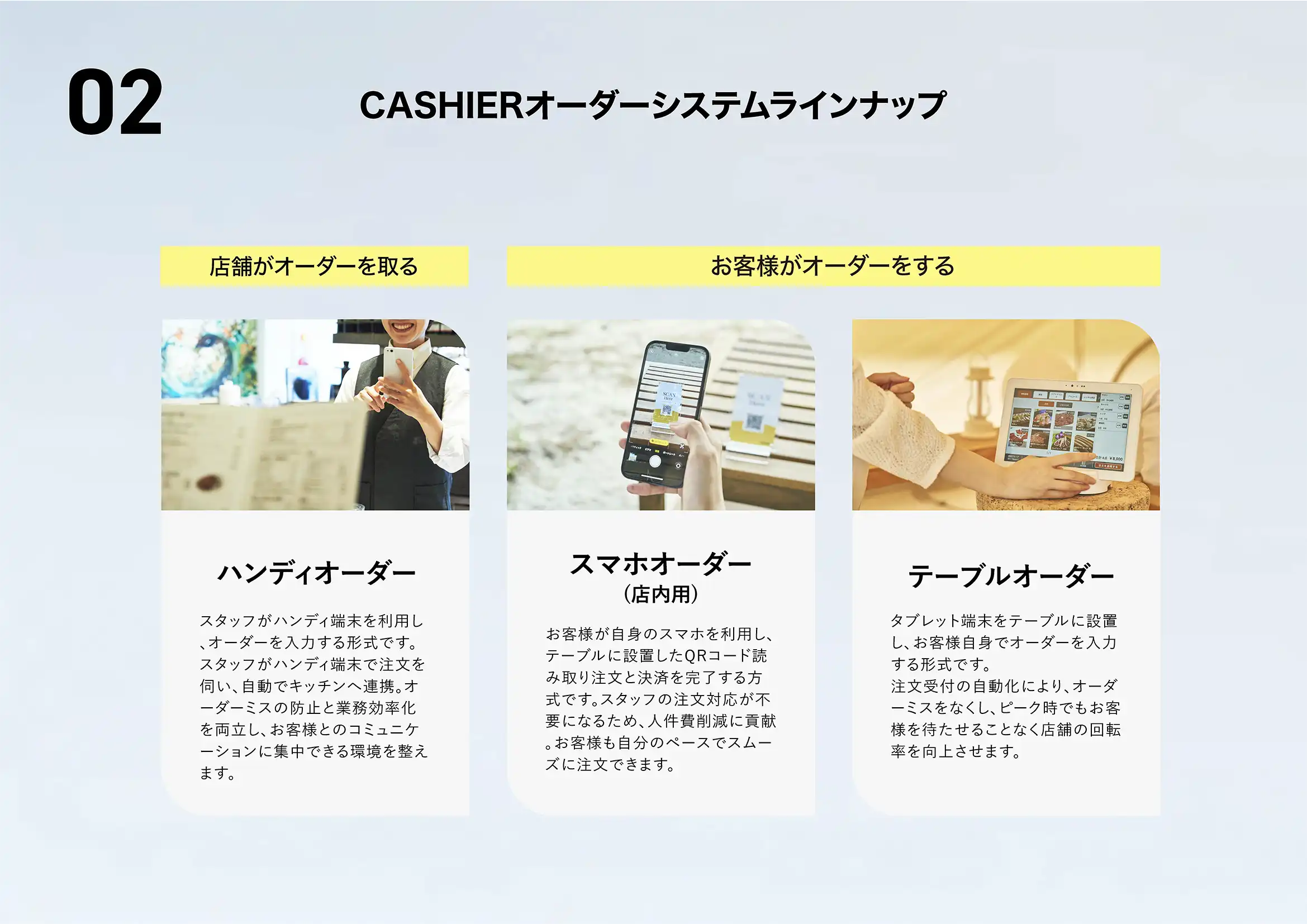 注文ミス、提供遅延、人件費の高騰にお悩みの飲食店経営者様へ。CASHIERの3種類のオーダーシステムで、店内注文をスマートに一元管理し、業務効率を劇的に改善しませんか?お客様自身のスマホで注文・決済を完結させるスマホオーダーは機材購入不要で人件費削減に貢献し、追加注文の機会UPにより客単価向上も期待できます。また、タブレット利用のテーブルオーダーは、飲み放題/食べ放題の注文管理も容易にし、店舗の回転率を向上させます。オーダー情報を自動で厨房に伝達するため、注文ミスがなくなり、スタッフは調理・配膳に集中可能。全国2,000店舗以上の幅広いお客様にご利用いただいており、お客様の運用スタイルに合わせた多彩な料金プランをご用意しています。まずは資料請求、またはお気軽にお問い合わせください。