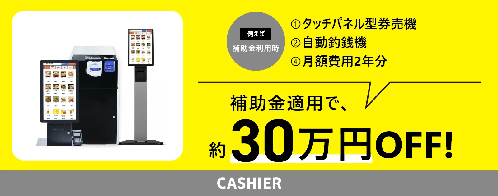 はい、補助金や助成金を利用してお得にCASHIER券売機の導入が可能です。但し、ご留意いただけなければならない事項もございますので、詳しくは一度弊社スタッフまでお気軽にお問い合わせください。