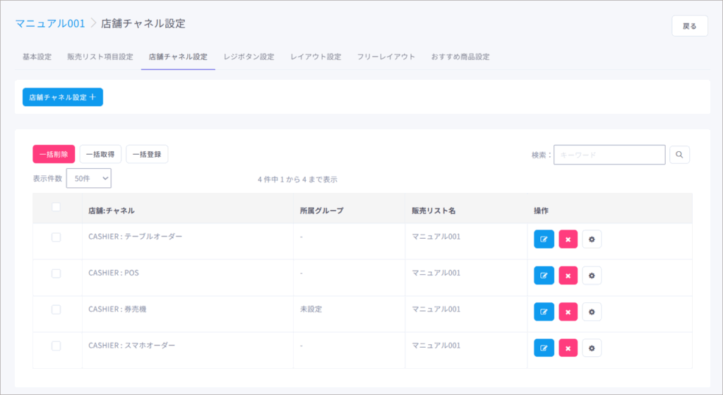 販売リスト項目やレジボタン設定、おすすめ商品設定は全チャネル共通です。