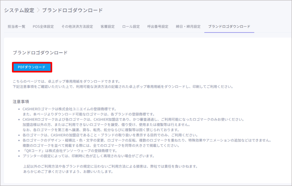 クライアント管理>システム管理(右上歯車マーク)>【ブランドロゴダウンロード】から、各種決済のブランドロゴをダウンロードできるようになりました。