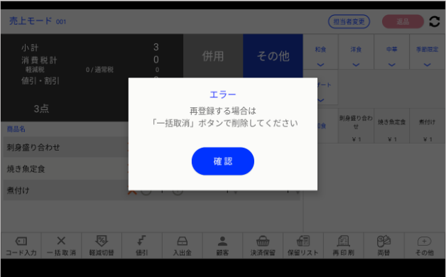 売上モードでカート内に商品がある状態で会計用バーコードを読み取った時、